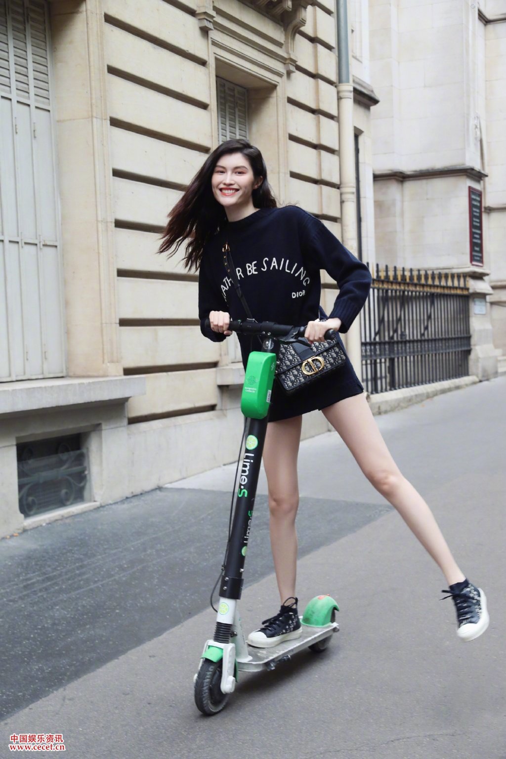 何穗在異國街頭玩滑板車(chē) 妝容精致長(cháng)腿吸睛