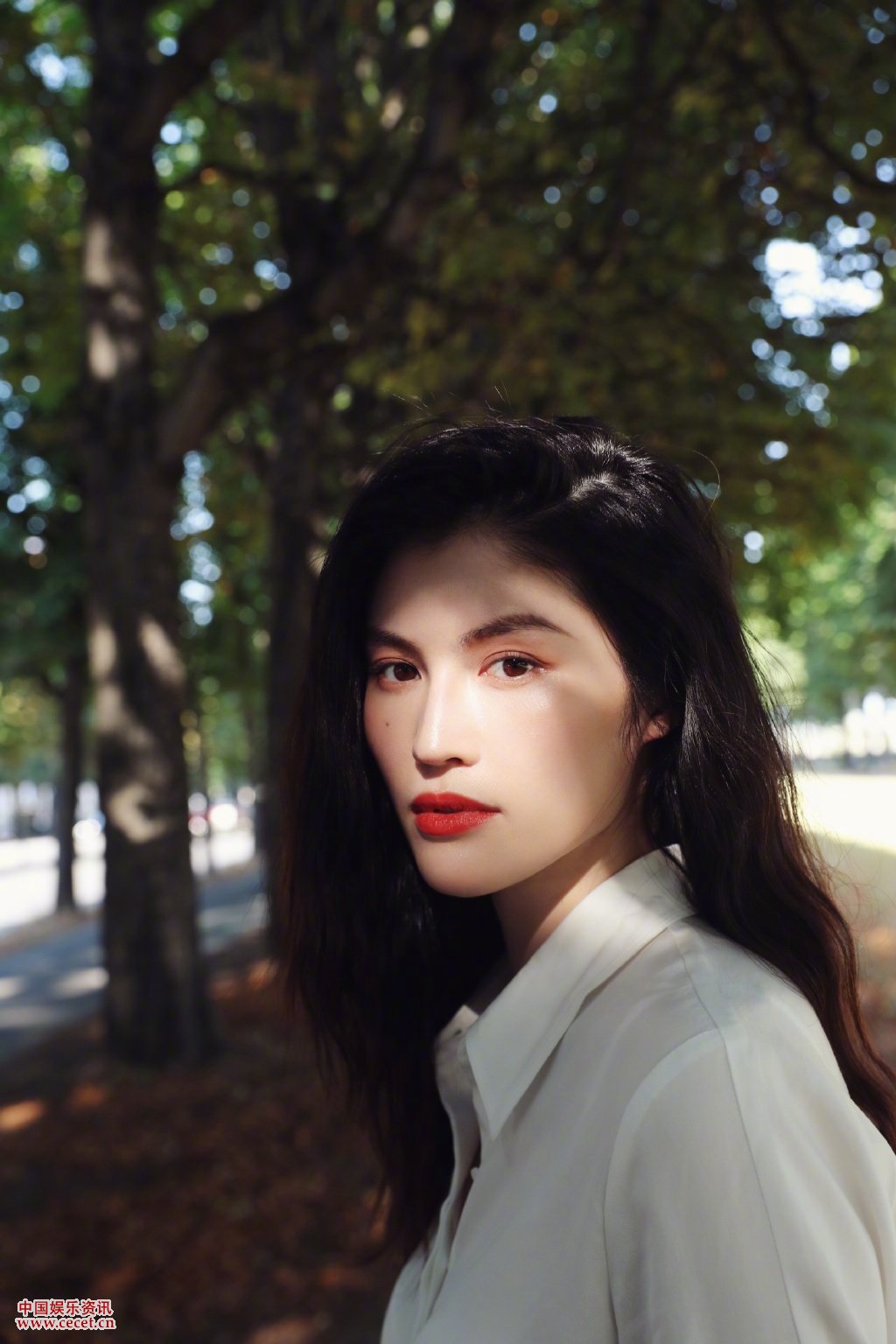 何穗白裙行走林蔭小道 紅唇美顏天生麗質(zhì)