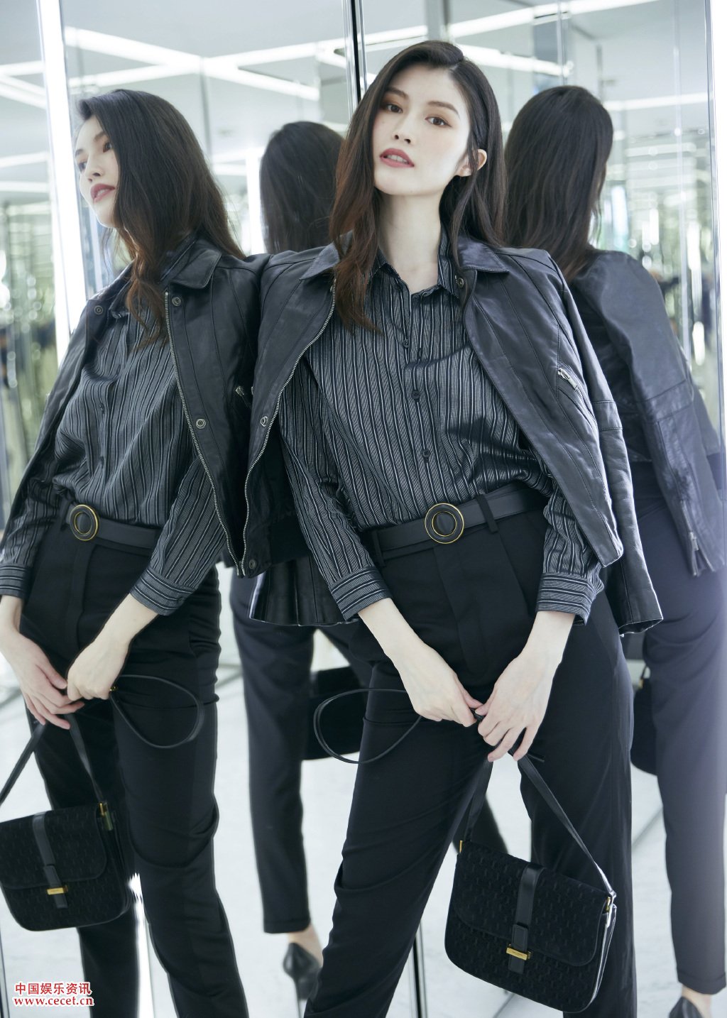 何穗皮衣外套搭配高腰西裝褲亮相硬朗干練