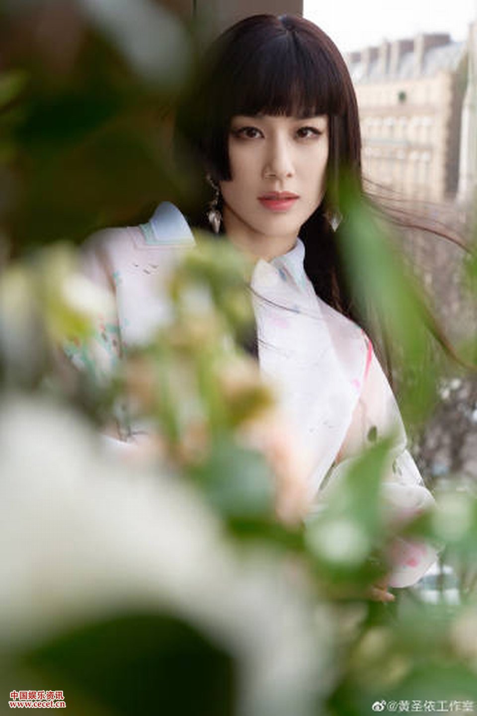 黃圣依水墨潑印暈染素紗長(cháng)衫映現東方韻美淡雅