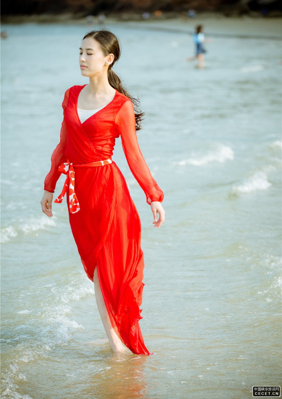 黃圣依紅裙悠然行走在陽(yáng)光沙灘 美艷氣質(zhì)出眾