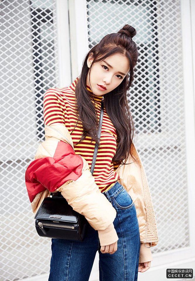 黃一琳街拍少女感十足 高領(lǐng)條紋衫搭配牛仔褲