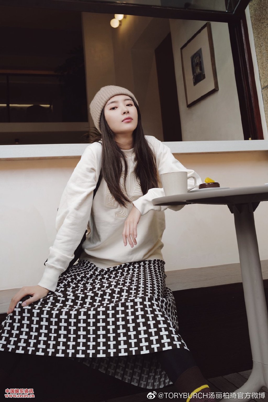 胡丹丹圓領(lǐng)衫與褶皺提花針織裙營(yíng)造復古氛圍