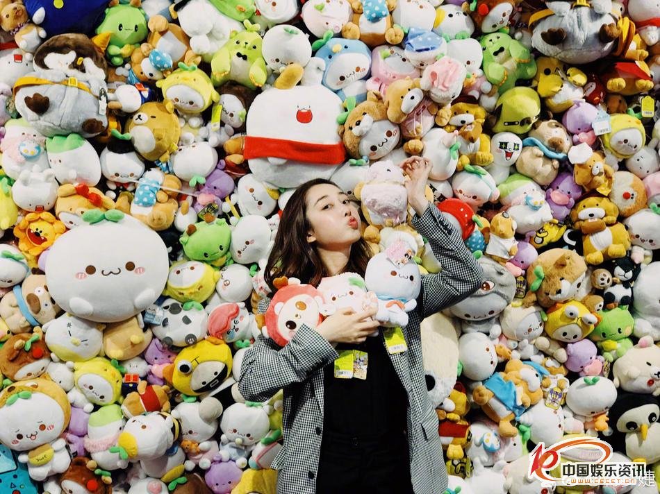 蔣夢(mèng)婕站在娃娃墻前照 可以說(shuō)是少女心和童真十足