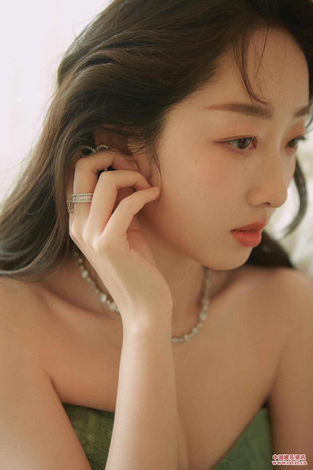 蔣夢(mèng)婕綠意抹胸裙美照 微醺純欲妝撩人心弦