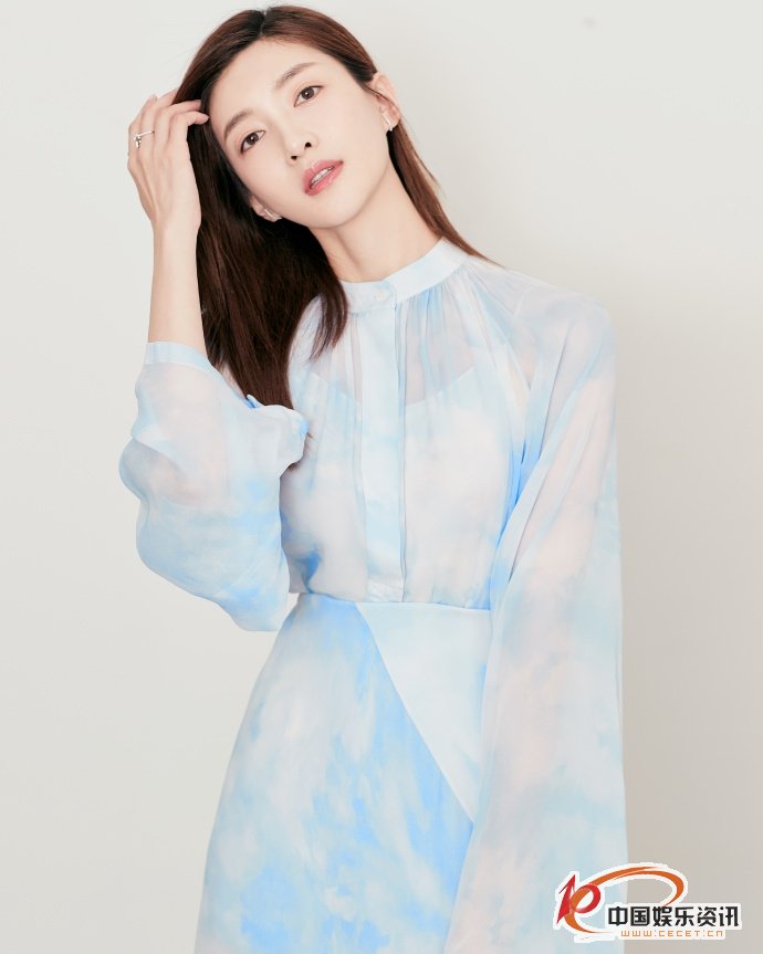 江疏影身穿透視水墨藍裙清新甜美嬌俏可人
