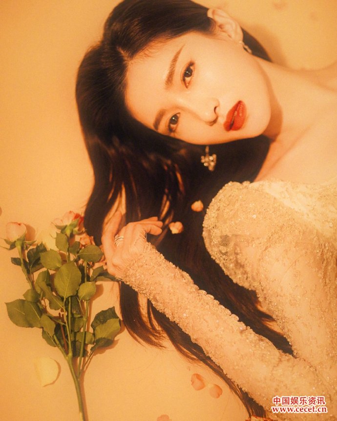 江疏影香檳色長(cháng)裙造型 如復古美人紅唇誘人
