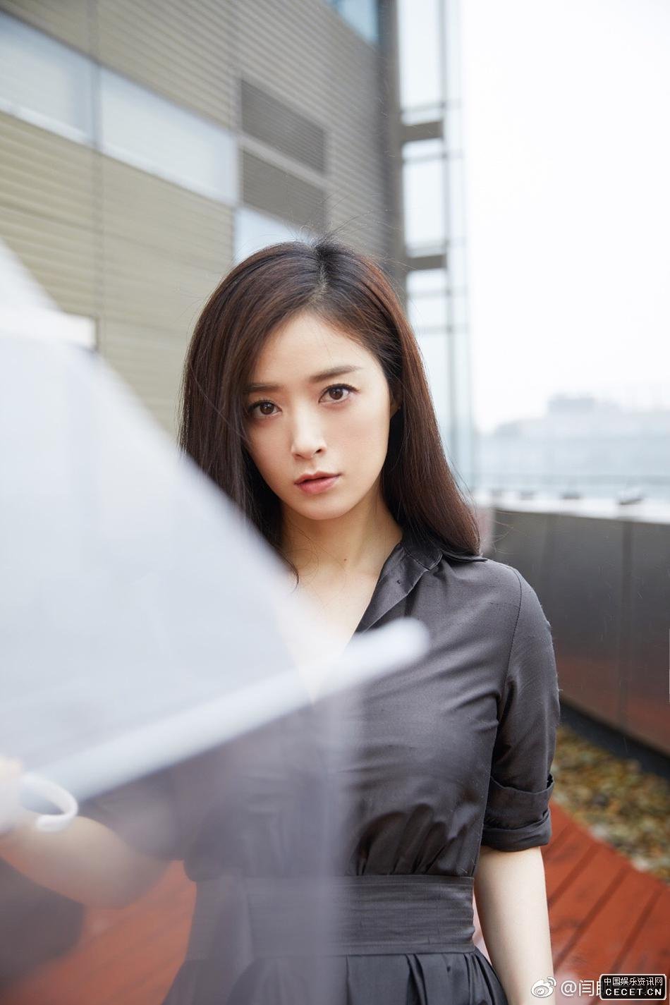 蔣欣黑色衣裙眼神霸氣 一手舉傘一手叉腰