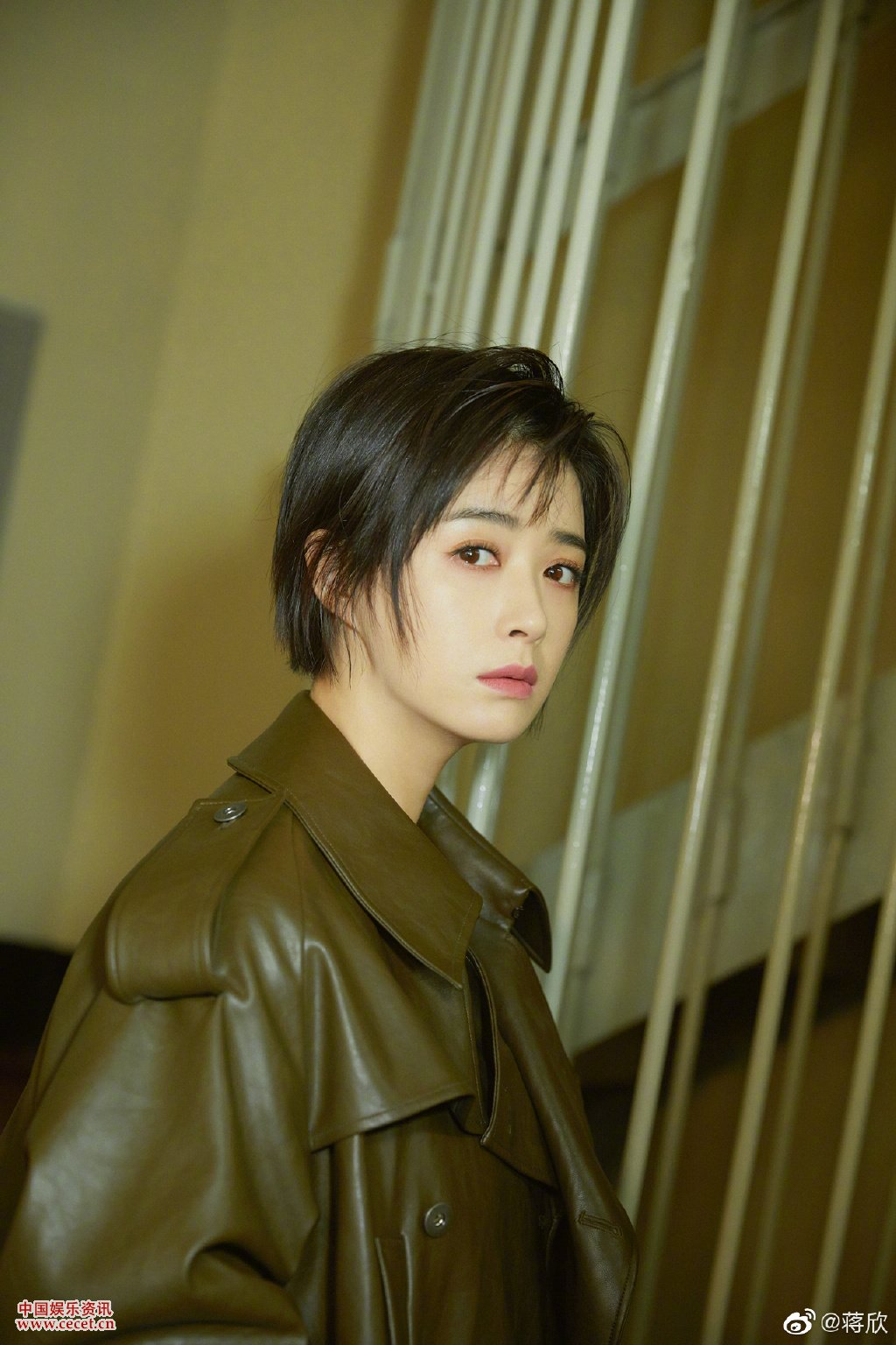 蔣欣皮質(zhì)短衣長(cháng)褲亮相 精致短發(fā)隨性自然