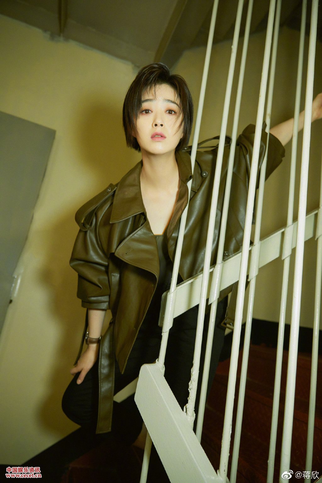 蔣欣皮質(zhì)短衣長(cháng)褲亮相 精致短發(fā)隨性自然