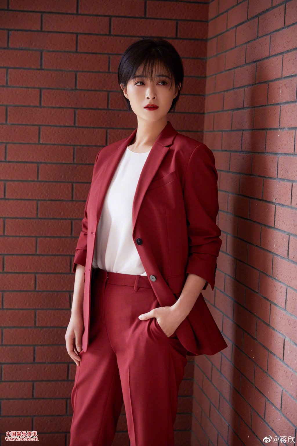 蔣欣蔓越莓色西裝復古優(yōu)雅 靈動(dòng)短發(fā)精致干練
