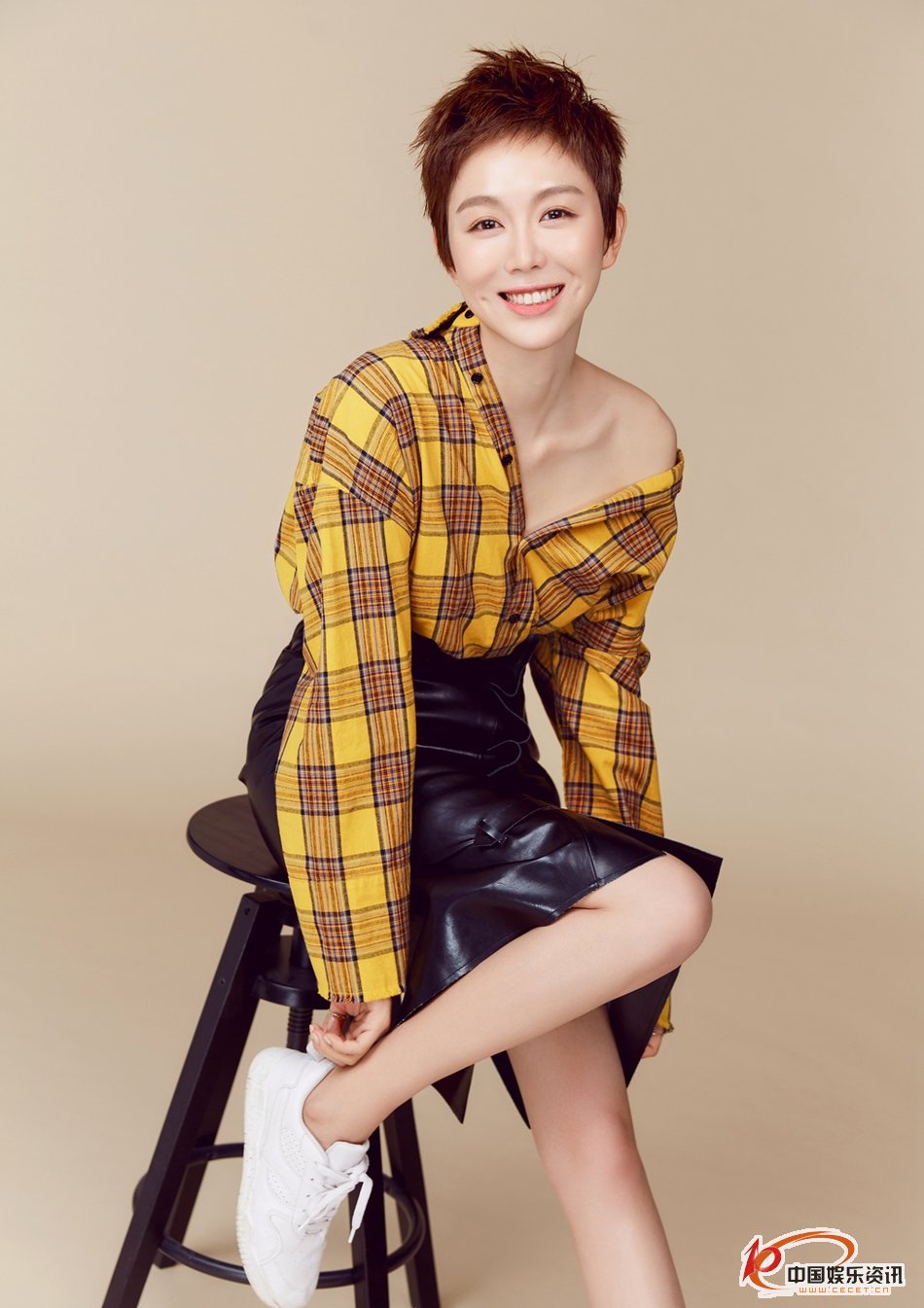 姜妍黃格襯衫小露香肩 清爽的短發(fā)長(cháng)腿好身材