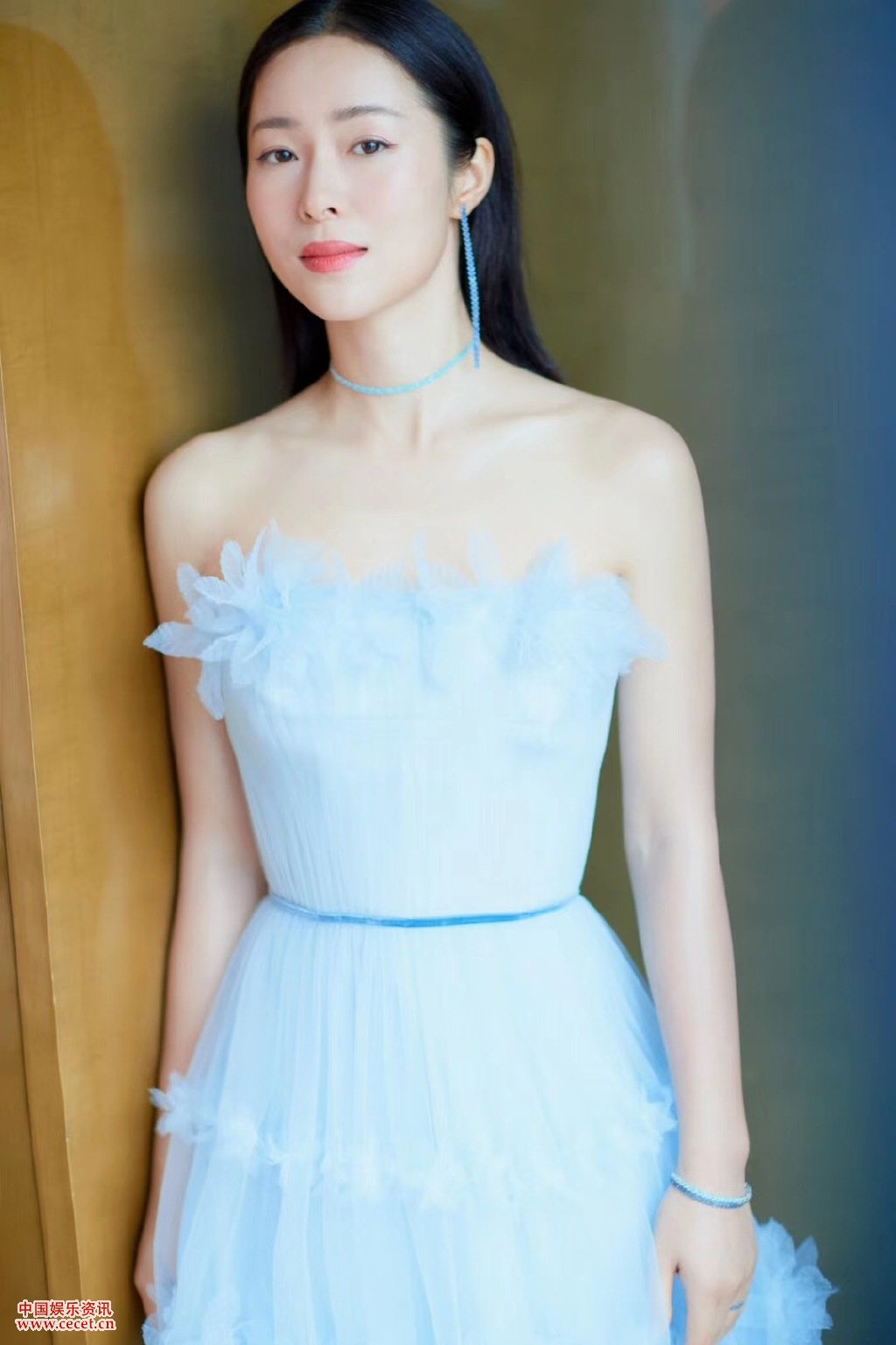 江一燕淺藍色抹胸薄紗禮服裙飄逸靈動(dòng)仙氣十足