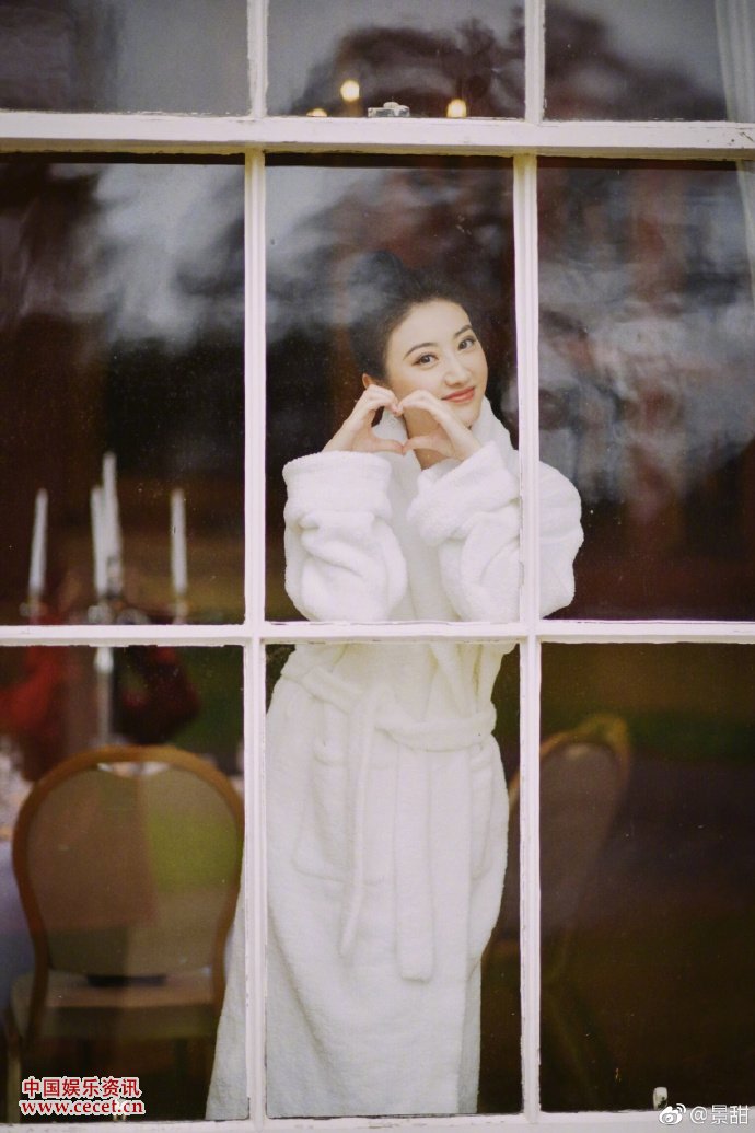景甜白色浴袍靠在窗前 窗上水霧蒙蒙更添仙氣