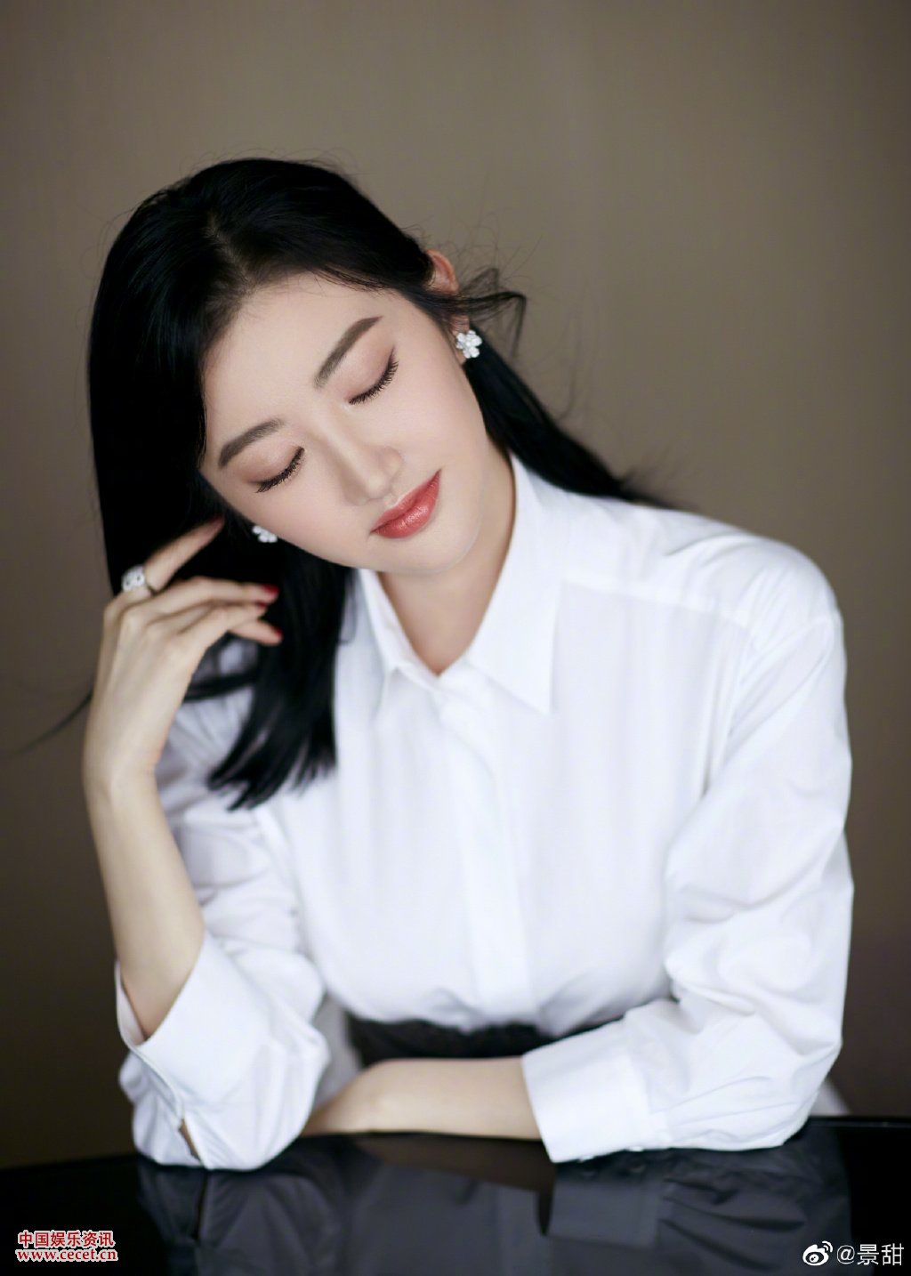 景甜白色襯衫裙美照 黑色蕾絲腰封更顯身材