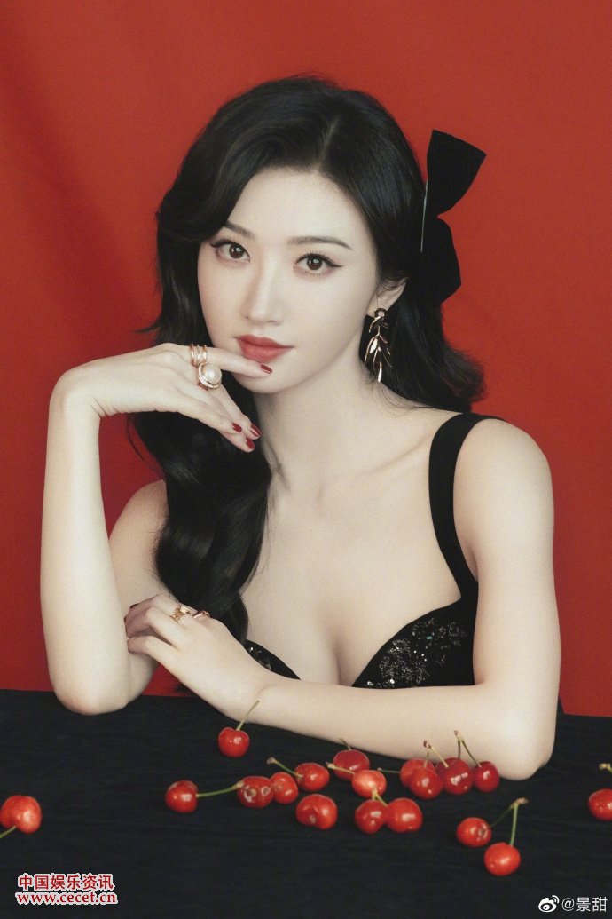 景甜復古港風(fēng)紅黑大片 吊帶深V禮裙甜美撩人