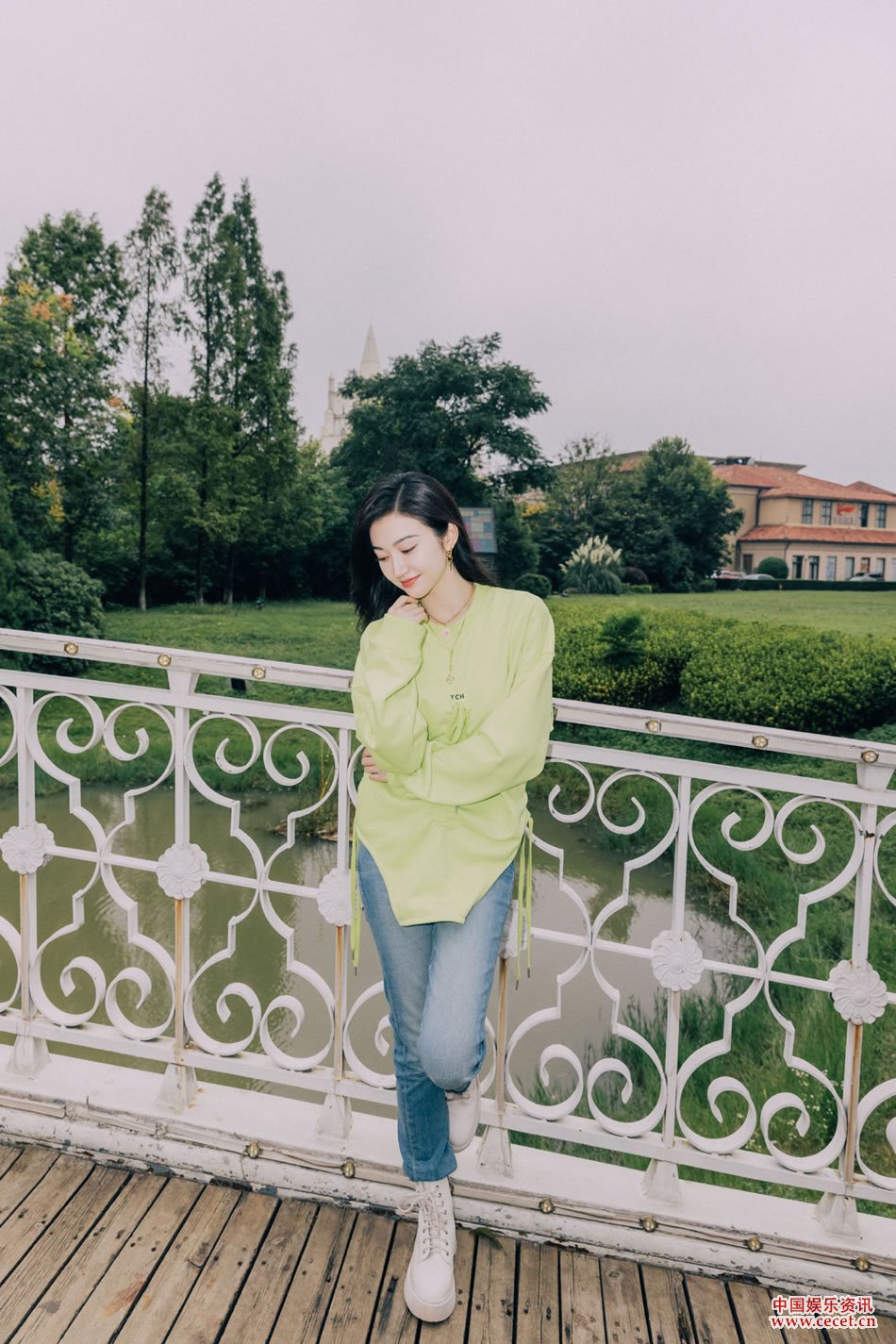 景甜身穿牛油果綠色衛衣搭配牛仔褲清新簡(jiǎn)約