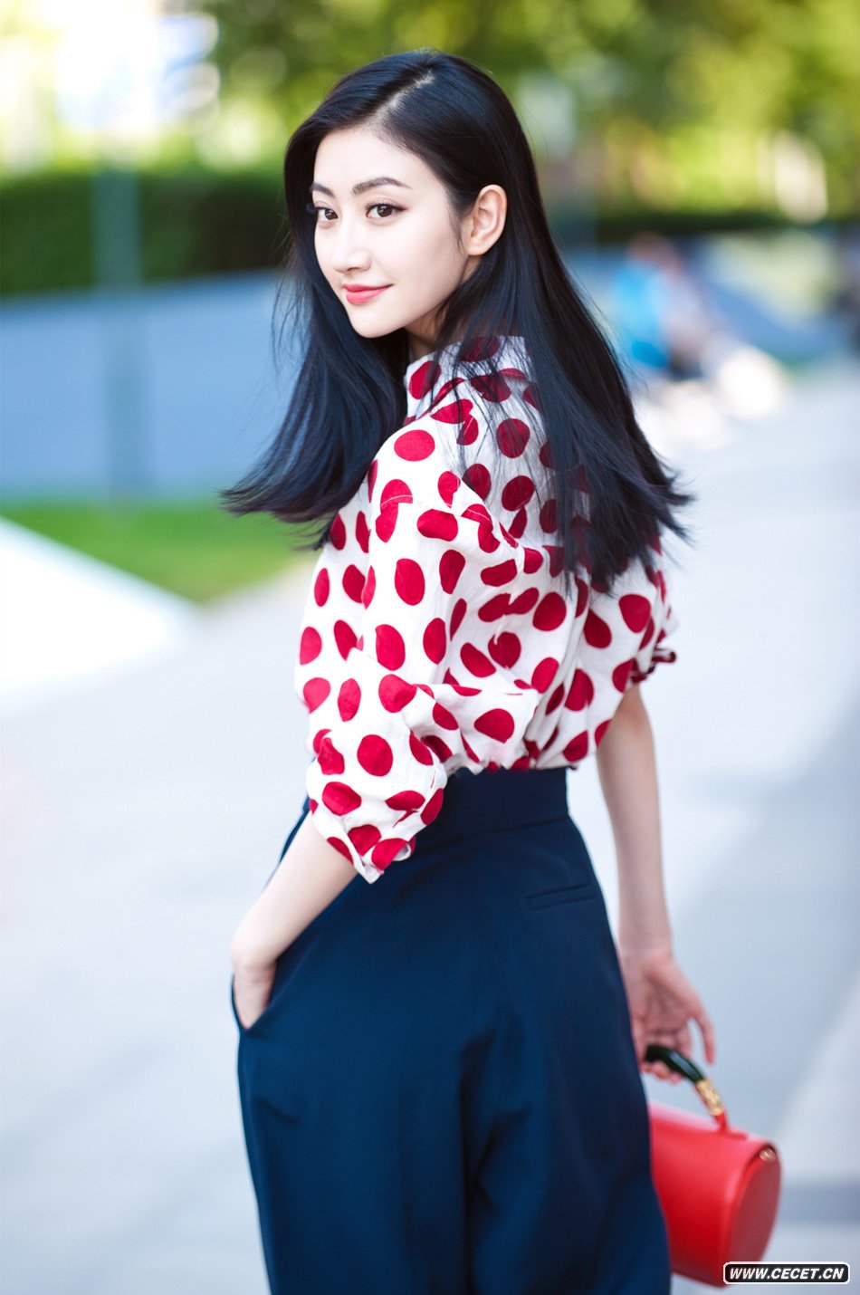 景甜一組初秋街拍曝光 一抹紅唇襯肌膚如雪