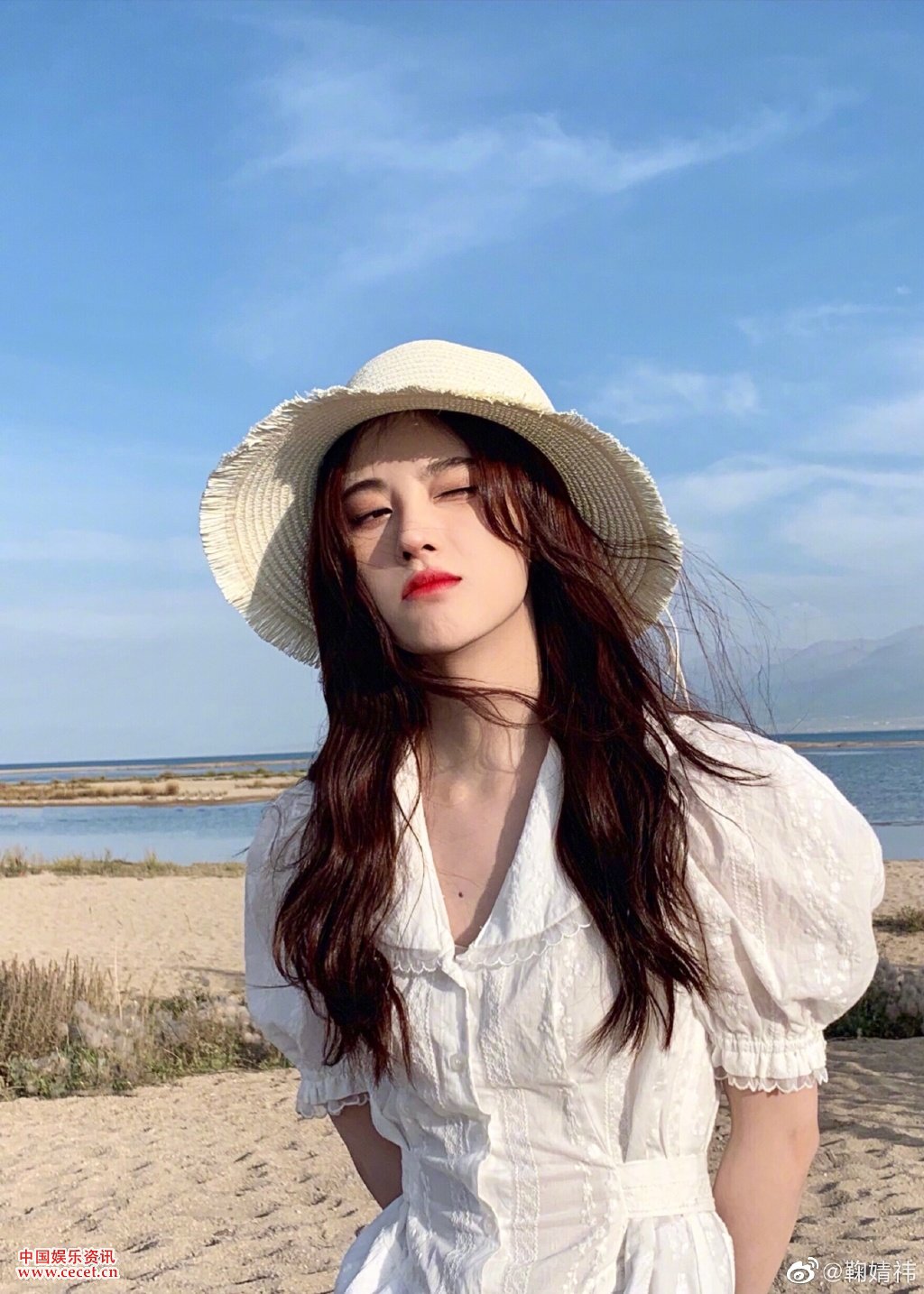 鞠婧祎海邊紅唇自拍照 清新可人氣質(zhì)甜美