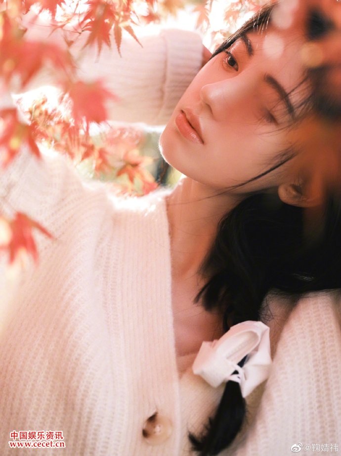 鞠婧祎扎著(zhù)麻花辮搭配白色毛衣氛圍感十足