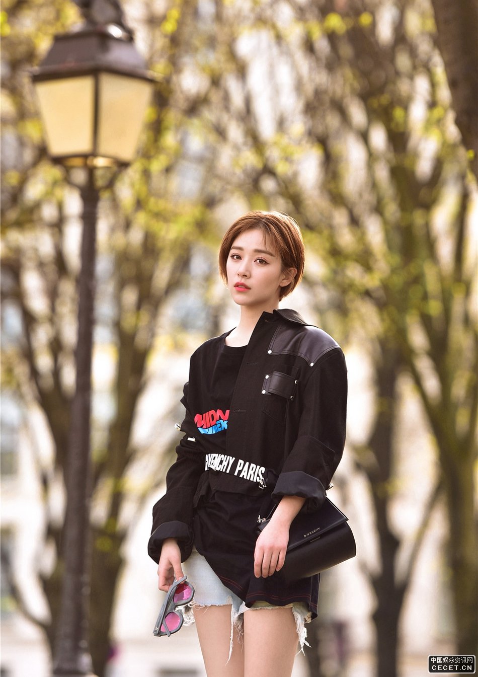 闞清子黑色長(cháng)T恤街拍 游走在巴黎街頭公園中
