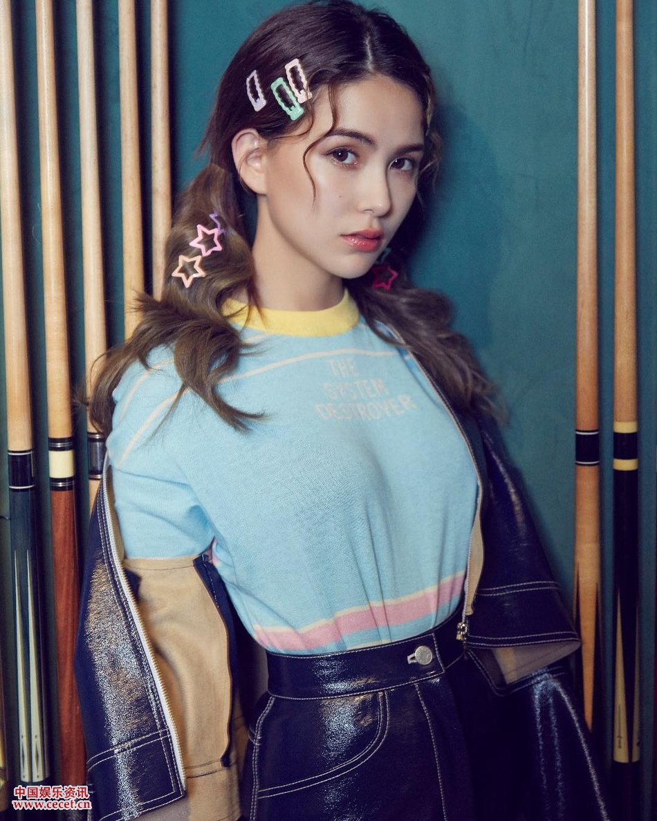 昆凌皮衣皮裙單手扶墻 綁著(zhù)低馬尾俏皮可愛(ài)