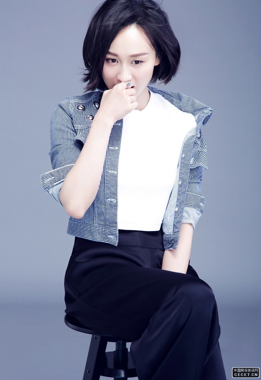 練束梅寫(xiě)真灑脫自然 淺藍色牛仔衣搭配闊腿褲