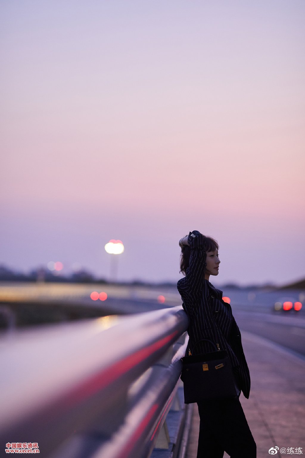練束梅破曉時(shí)分現身機場(chǎng) 黑色條紋西簡(jiǎn)約利落