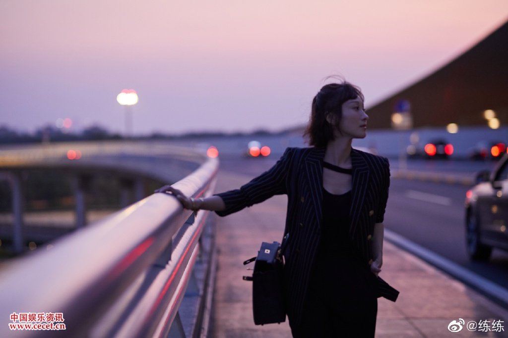 練束梅破曉時(shí)分現身機場(chǎng) 黑色條紋西簡(jiǎn)約利落