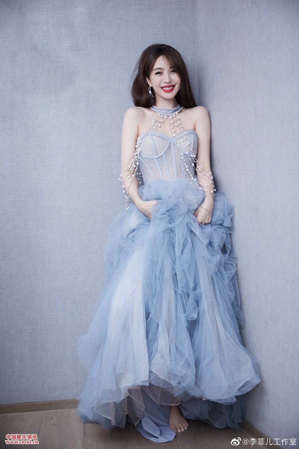 李菲兒身著(zhù)藍色珍珠抹胸仙女裙 俏皮可愛(ài)