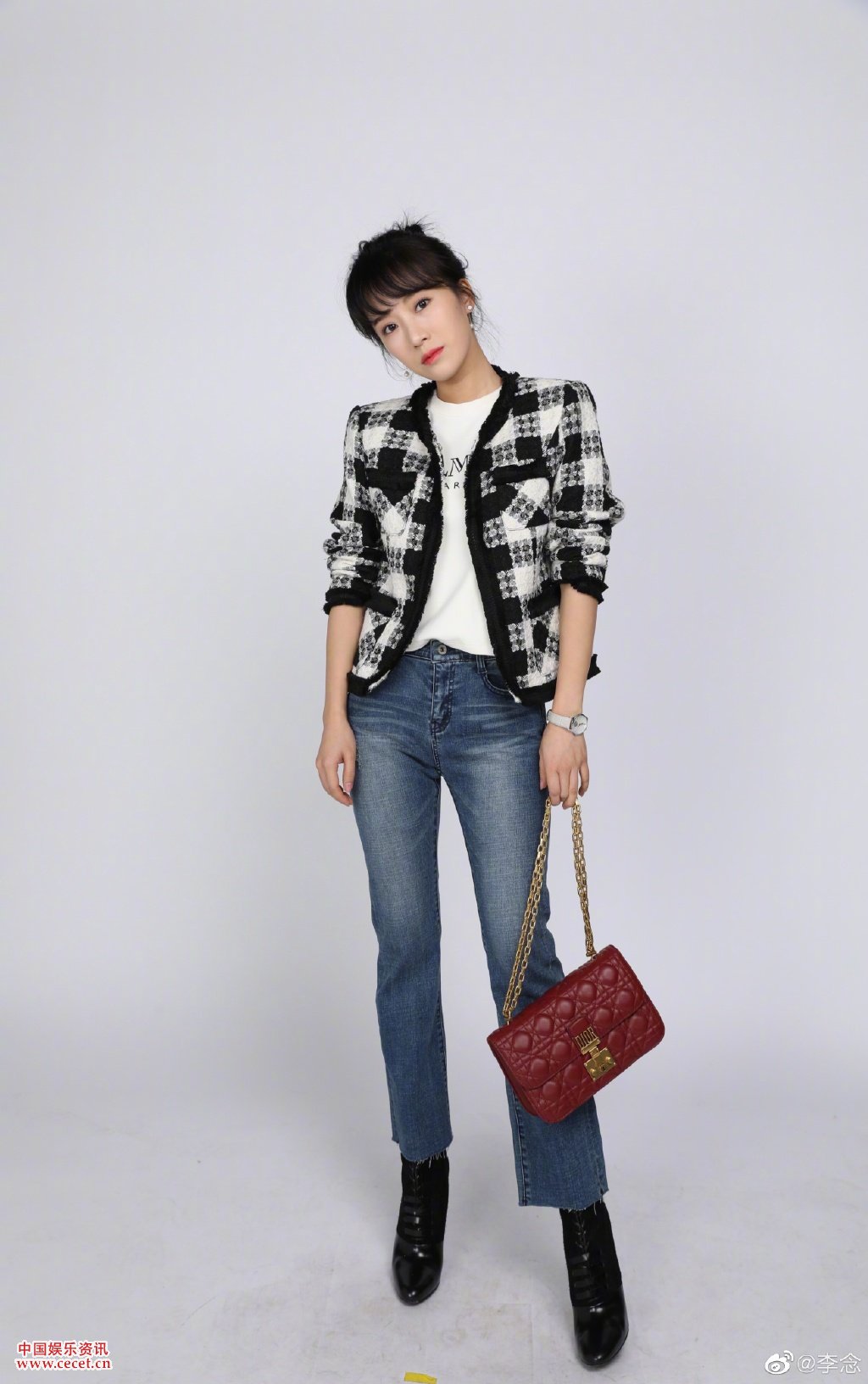 李念格子外套搭配牛仔褲一抹明媚釋放春日燦爛