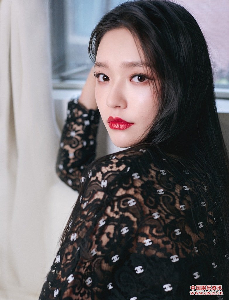 林允復古黑色蕾絲套裝美艷動(dòng)人 一抹紅唇超吸睛