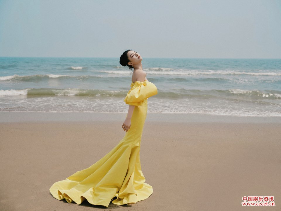 林允溫柔暖黃色拖尾裙 盡情享受陽(yáng)光與海風(fēng)
