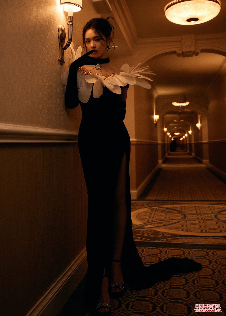 林允復古花朵禮服裙 高開(kāi)衩長(cháng)裙美腿吸睛