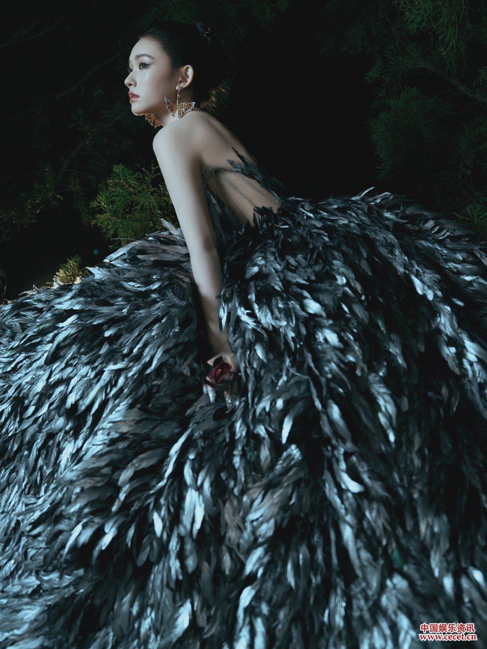 林允化身暗夜古堡黑天鵝 流光幻羽間深邃又迷人