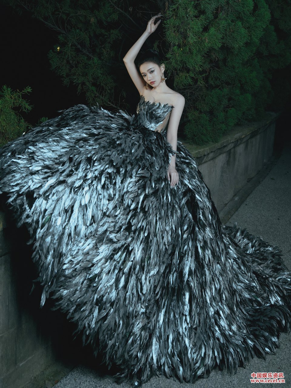 林允化身暗夜古堡黑天鵝 流光幻羽間深邃又迷人