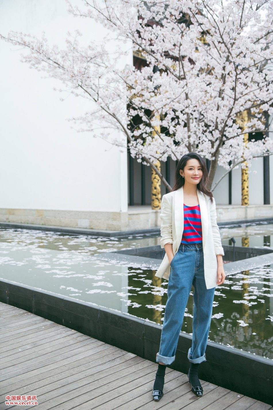 李沁在櫻花樹(shù)下的美照 中性裝扮干練帥氣