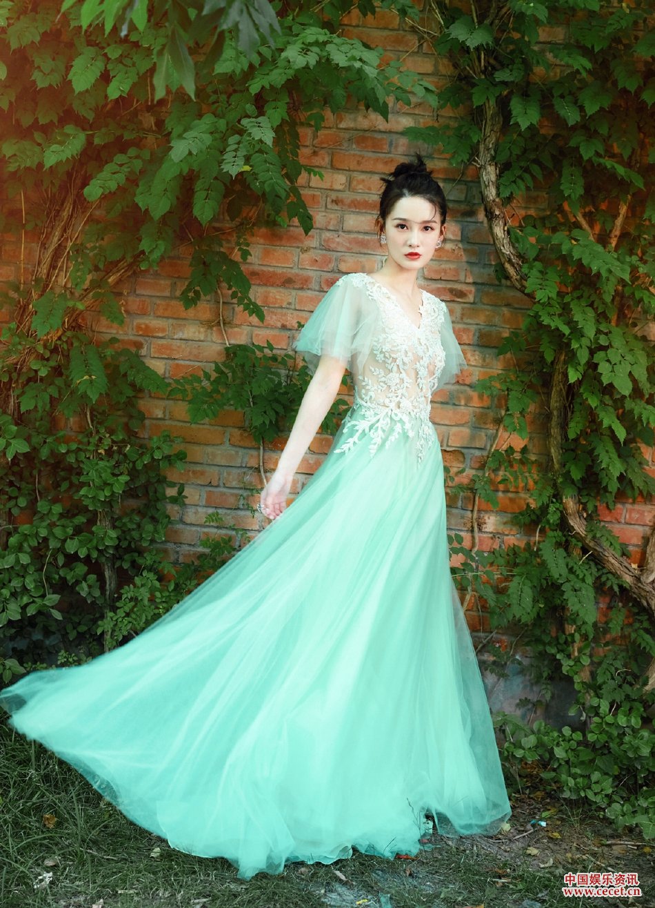 李沁薄荷綠色紗裙美照 精致貌美似下凡的仙女