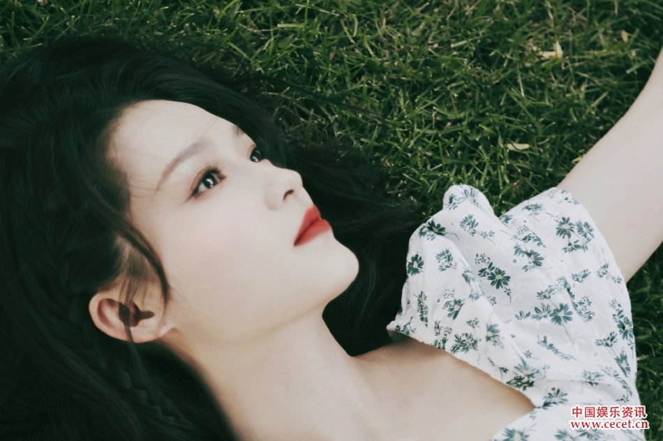 李沁淺綠色碎花裙寫(xiě)真 置身草地中感受溫暖