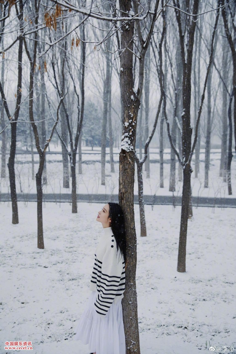 李沁九宮格雪景寫(xiě)真 黑白條紋毛衣清新淡雅
