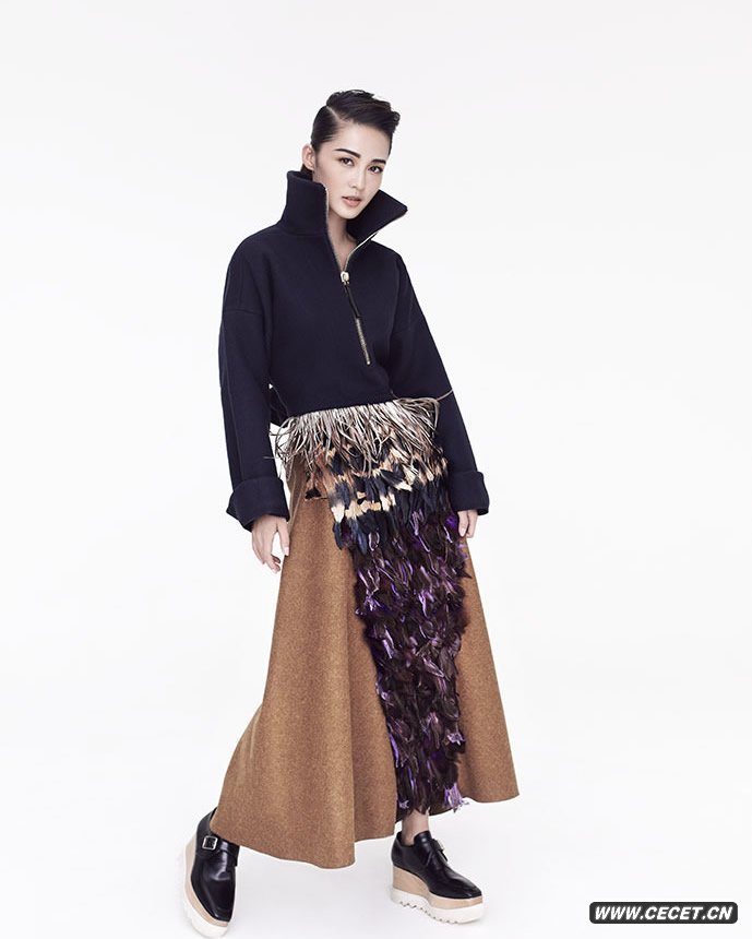 李沁全新時(shí)尚造型 粗眉妝容配上野性羽毛長(cháng)裙