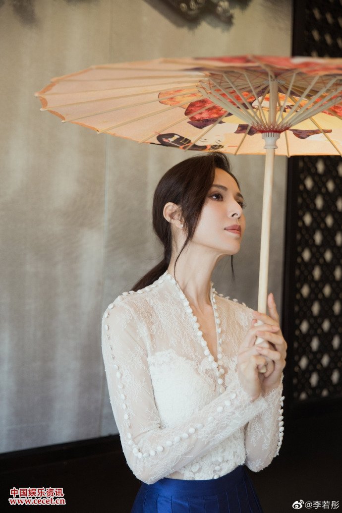 李若彤蕾絲襯衫藍長(cháng)裙 手撐油紙傘顯古典韻味