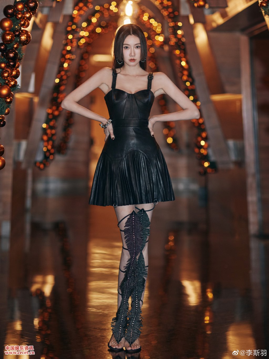李斯羽皮質(zhì)吊帶短裙照 夸張造型氣場(chǎng)十足