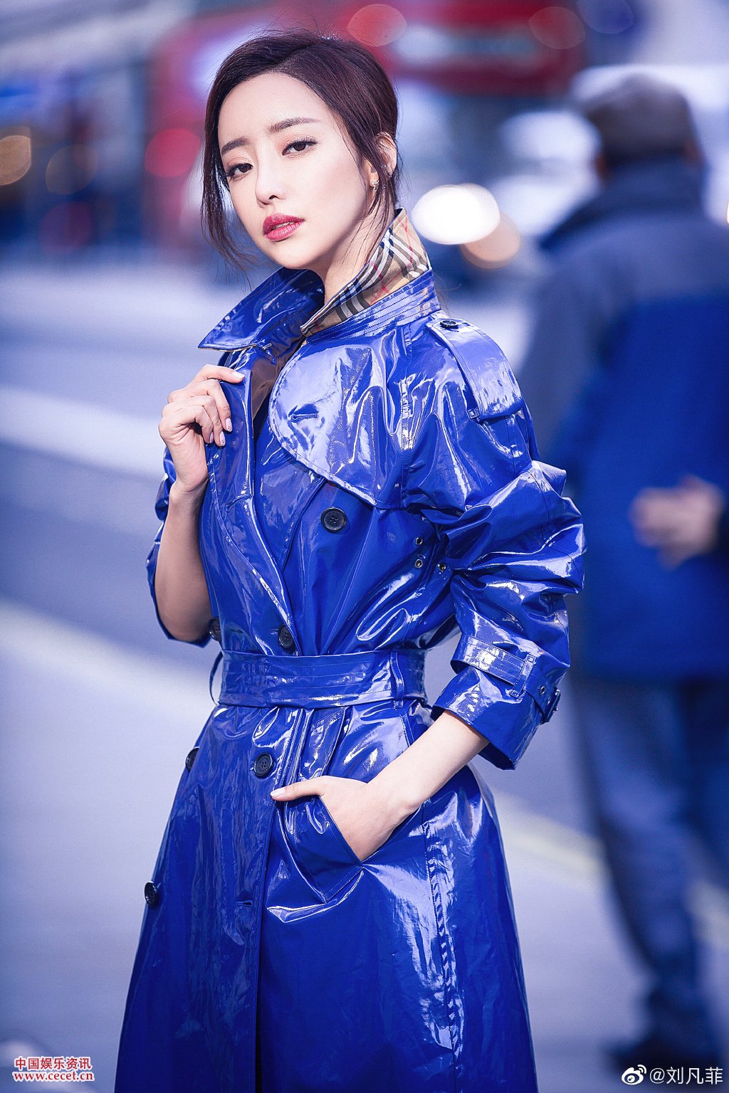 劉凡菲藍色長(cháng)款風(fēng)衣照 對著(zhù)鏡頭擺酷帥造型