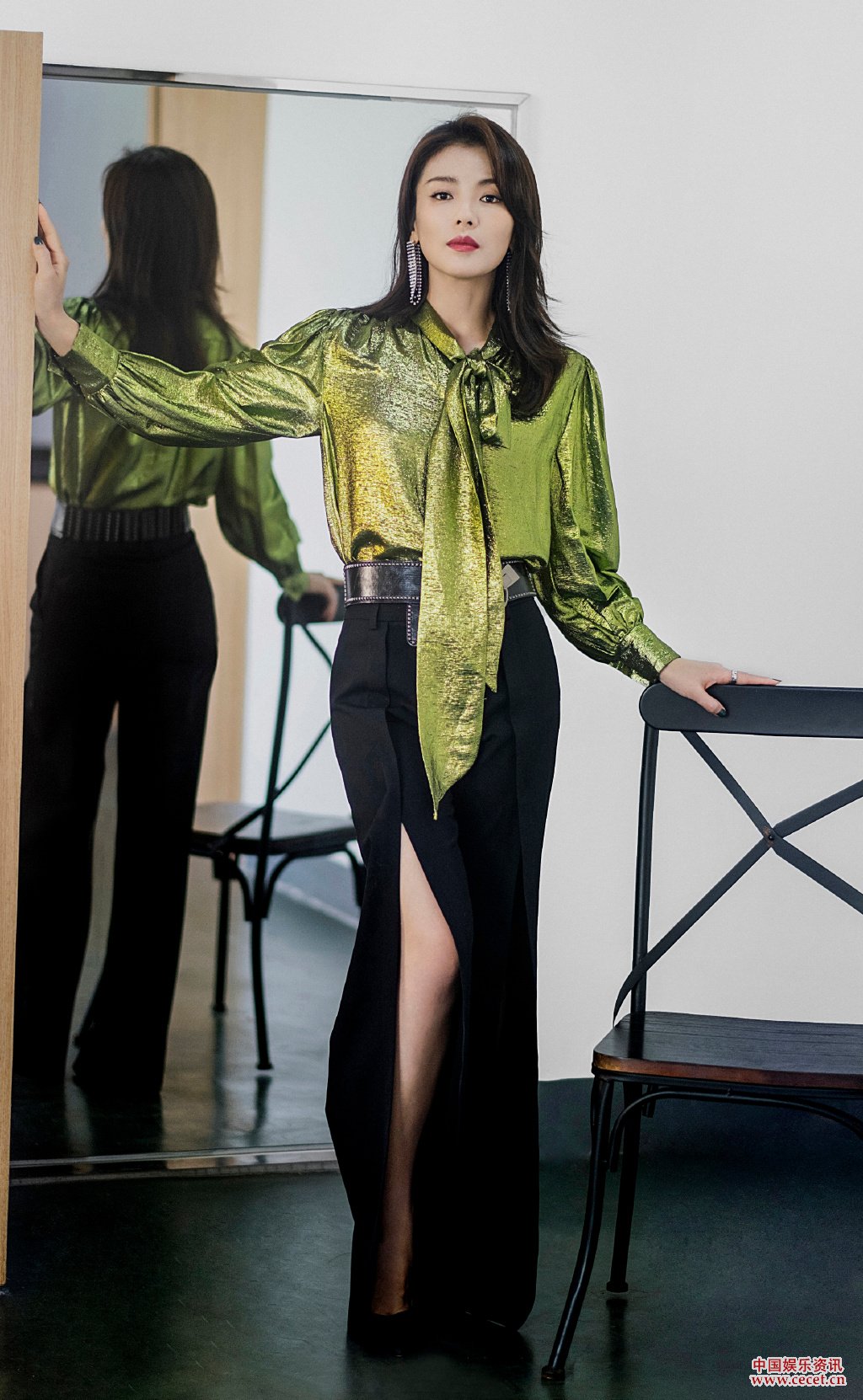劉濤森綠上衣搭配開(kāi)叉黑色長(cháng)褲大秀美長(cháng)腿