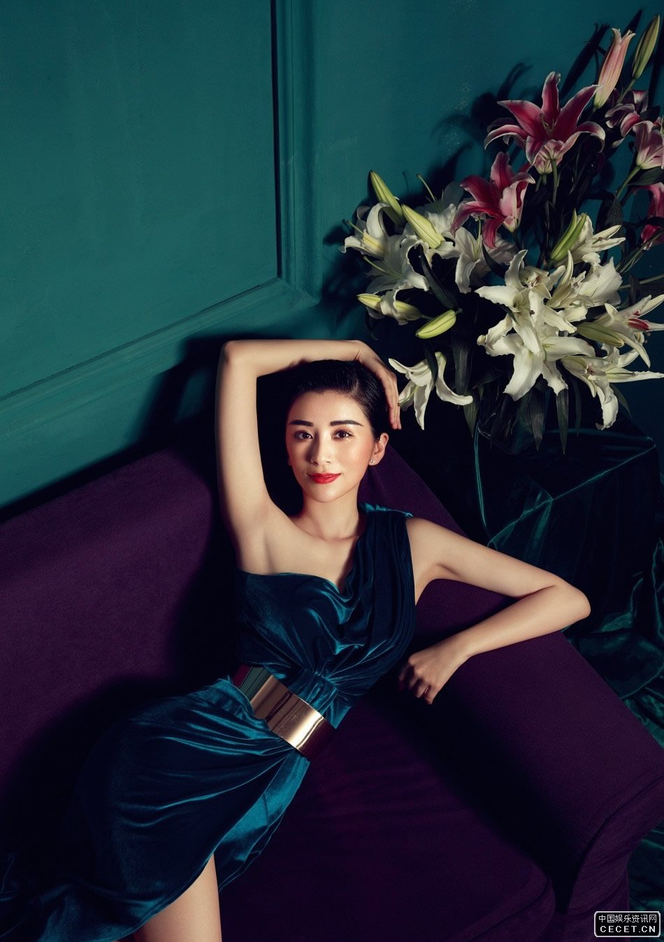 劉庭羽古堡風(fēng)復古寫(xiě)真 孔雀藍開(kāi)叉裙美腿外露