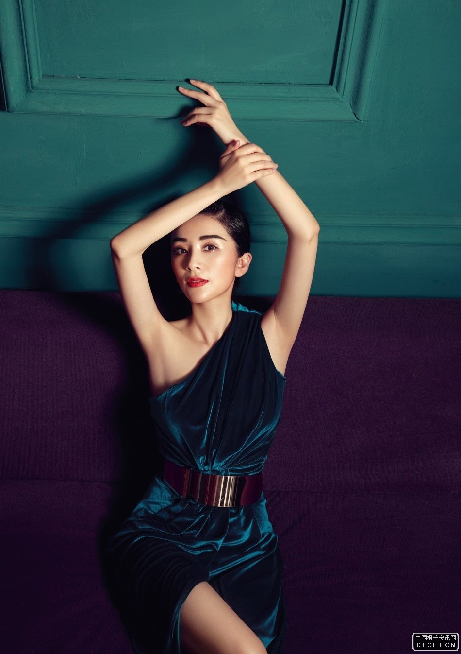 劉庭羽古堡風(fēng)復古寫(xiě)真 孔雀藍開(kāi)叉裙美腿外露