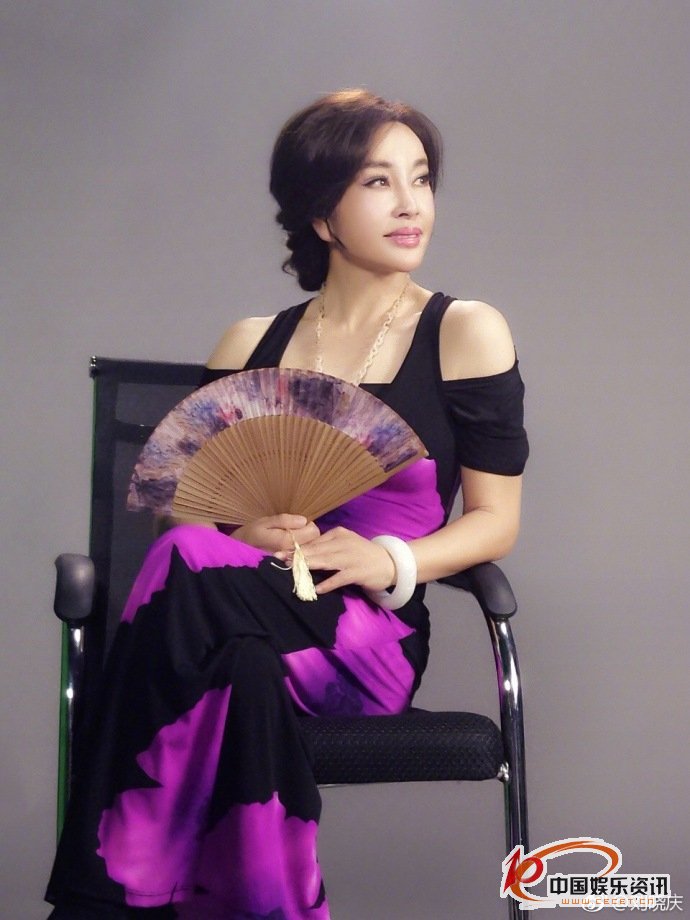 劉曉慶頭發(fā)盤(pán)起手握折扇看上去女人味十足