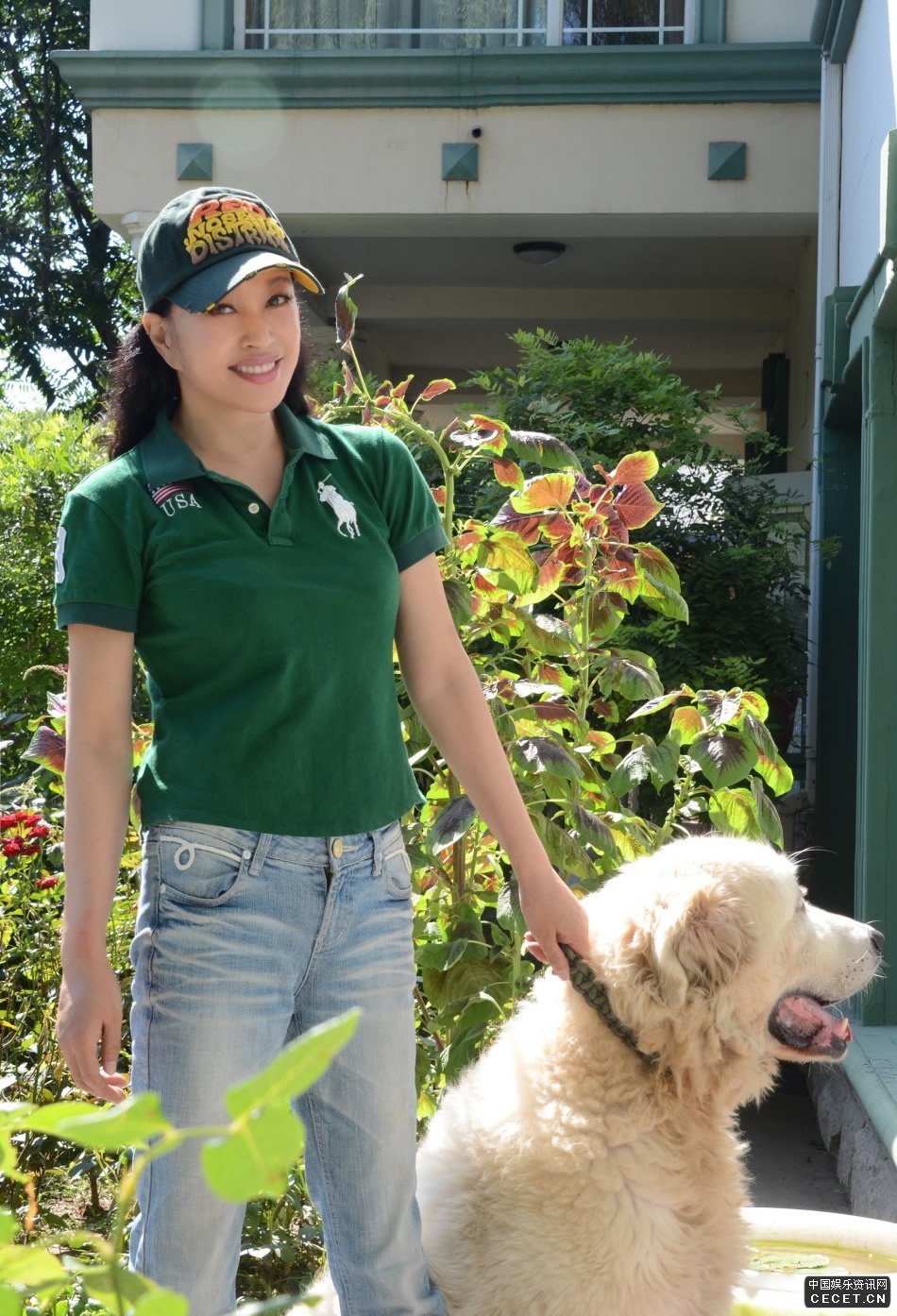 劉曉慶分享一組在草坪上與狗狗玩鬧的照片