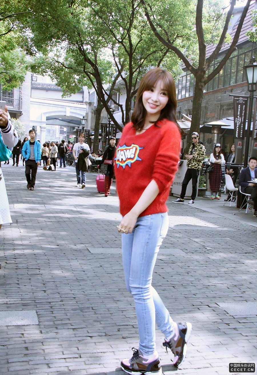 柳巖紅衣雪膚休閑裝扮 搭訕街頭時(shí)尚達人